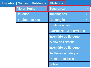 Para acessar a Tela de Alteração de senha é preciso ir ao Menu “Utilitários - Segurança - Alterar Senha”.