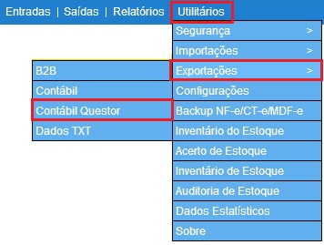 Para acessar a Tela de Importação de Dívidas Bancárias é preciso ir ao Menu “Utilitários – Exportação - Contábil Questor”.