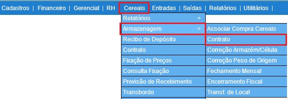 Para acessar, use o Menu “Cereais - Armazenagem - Contrato”.
