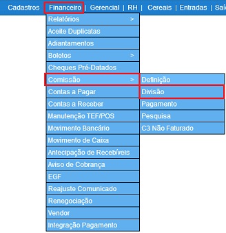 Para acessar Financeiro – Comissão - Definição, use o Menu “ Financeiro – Comissão - Divisão”. Será apresentada a tela principal de Comissão - Divisão.