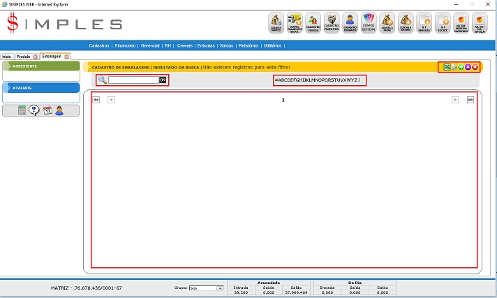 Será apresentada a tela principal de Embalagens, a seguir: