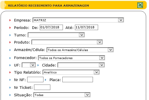 Para acessar este relatório é preciso ir ao Menu “ Relatórios - Análise - Relatório Recimento Armazém"