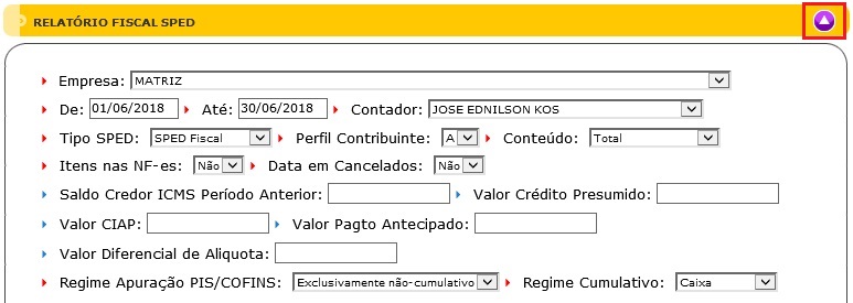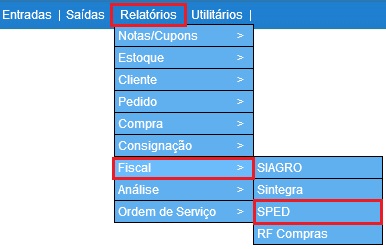 Para acessar este relatório é preciso ir ao Menu “ Relatórios-Fiscal-SPED”.