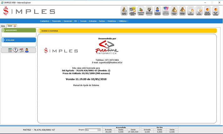 Mostra a empresa para qual a cópia está licenciada, a sua versão e data.